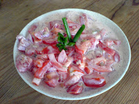 Tak przygotowaną mieszaniną polewamy pokrojone pomidory, ogórki i sałatę (posolone i przyprawione pieprzem).